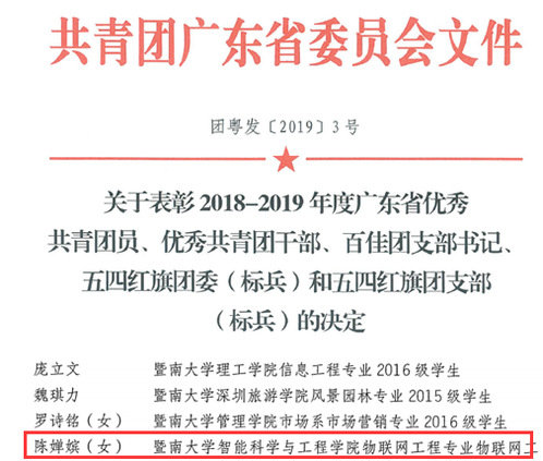 近日,为表彰先进,树立典型,共青团广东省委发文表彰了一批优秀团组织、团员青年和团干部,其中350vip浦京集团官网2016级物联网工程专业本科生陈婵嫔因学业优秀、表现突出被广东共青团授予“广东省优秀共青团员”称号,全校仅6人获此荣誉,也是珠海校区唯一获奖学生。