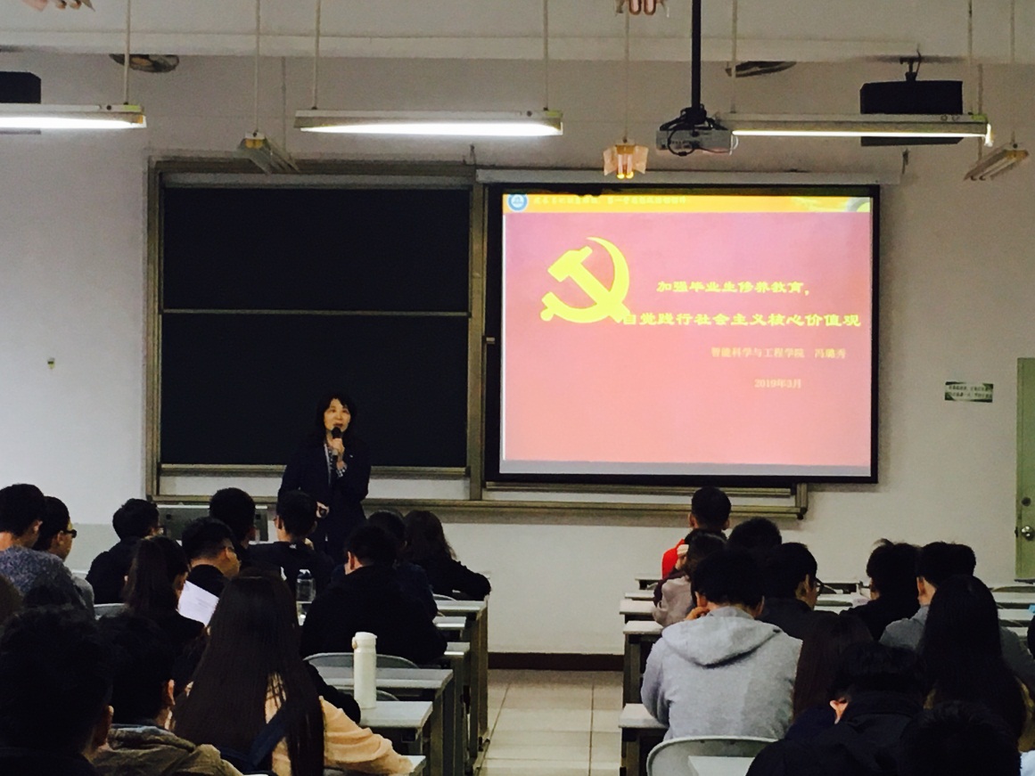 3月14日下午,350vip浦京集团官网党支部书记冯璐秀以“加强毕业生修养教育,自觉践行社会主义核心价值观”为主题,给学院学生开展了一场形式活泼、内容丰富的思想政治理论课。学院辅导员、毕业生代表等120余人参加了此次思政课。