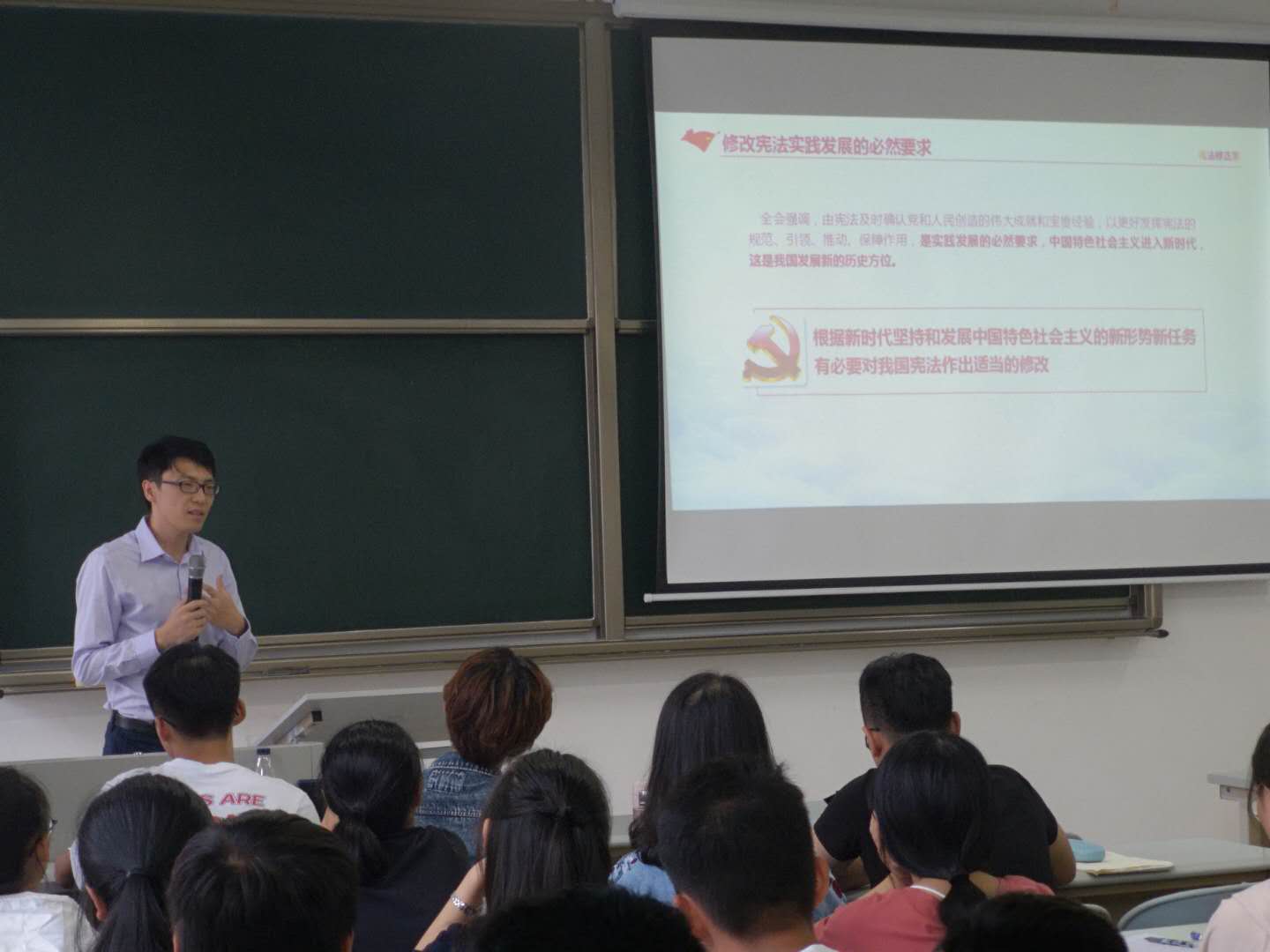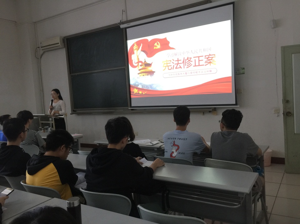2.集体教授:学院专门制作专题课件,统一讲授,集中给学生展示相关内容,落到实处。主管学生工作的领导、辅导员或班主任通过讲授宪法修正的背景、必要性、主要内容等,启迪学生学法、懂法、用法意识。