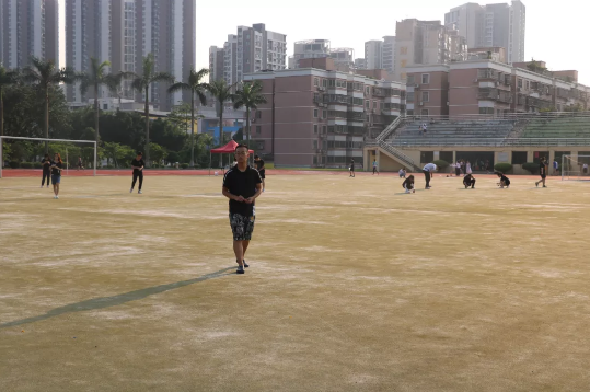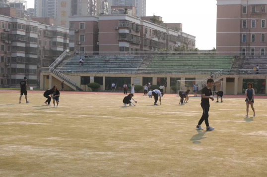 待同学们都离开后,工作人员纷纷在足球场拾起垃圾。