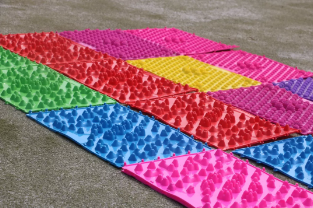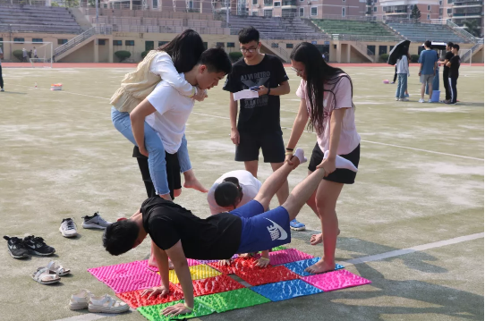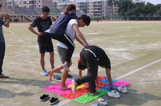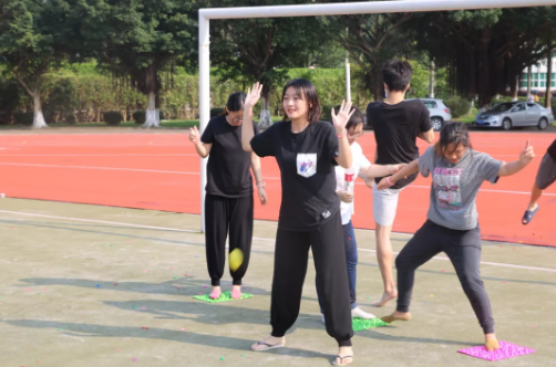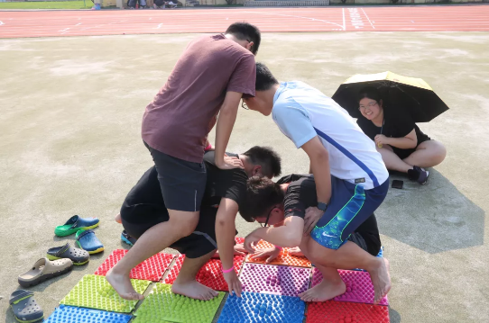游戏四:一人负责运送漏水的水瓶,前后左右各一人,在左右的同学负责抵挡工作人员扔来的水球,前后两人则负责铺指压板。限时6分钟,运送的水量和站中间的同学被水球砸的次数都会影响获得的金币。