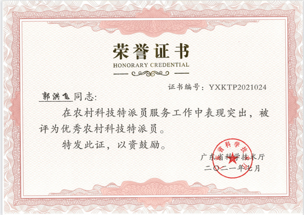 我院郭洪飞老师被广东省科技厅评为优秀农村科技特派员荣誉称号