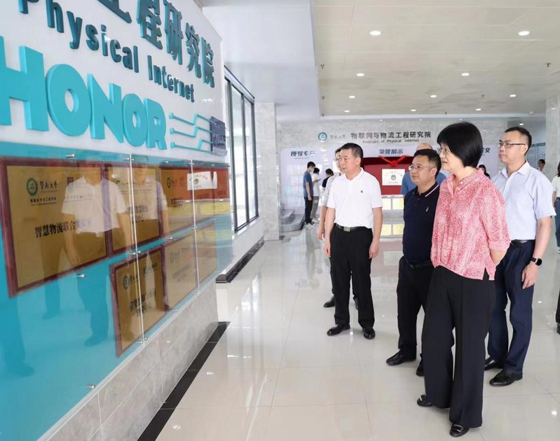 与会领导共同为“郭洪飞委员工作室”进行了揭牌。揭牌仪式后,陈静一行实地参观了“郭洪飞委员工作室”、物联网与物流工程研究院。