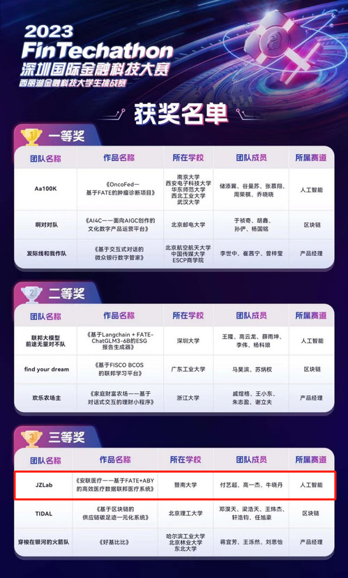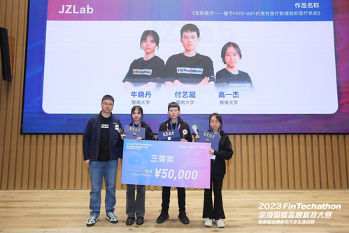 12月16日-18日,由深圳市政府、微众银行、深圳香蜜湖国际金融科技研究院等多方联合举办的2023FinTechathon深圳国际金融科技大赛落下帷幕。本届大赛历时3个月,共有近300支学生队伍参加。其中,由智科学院学生团队完成的项目《安联医盟——基于FATE+ABY的高效医疗数据联邦学习系统》一路过关斩将,最终成功晋级决赛并荣获人工智能赛道第三名。