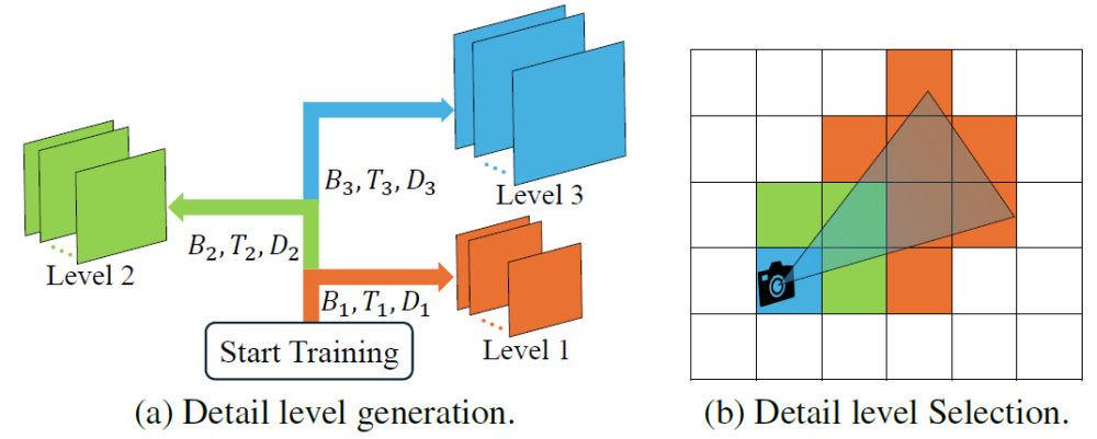 提出创新的分区内资源优先调度策略,在显著降低显存占用的同时提升重建速度;同时提出了可控细节层次(Level of Detail, LOD)生成策略,实现自底向上的多尺度建模,确保城市级场景的实时渲染性能。